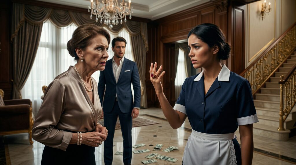 El silencio que invadió el vestíbulo principal de la mansión fue ensordecedor. Ya no se escuchaban los crujidos de los zapatos de diseñador ni el tintineo de las joyas caras que la señora Victoria ostentaba en sus muñecas. Lo único que llenaba el espacio era la respiración agitada de la matriarca, cuyos ojos estaban fijos, casi desorbitados, en la piedra roja que brillaba en la mano de la joven sirvienta.